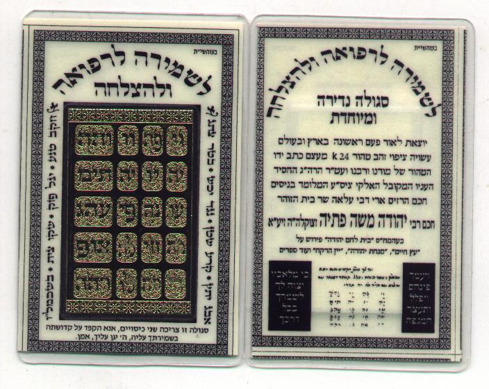 The Kabbalistic amulets are 24 Karat Gold plated and measures a little over 3 1/4 x 2 1/4 inches. Each amulet is made from metal and plated over the metal. The amulet is laminated so it will not get ruined by daily wear & tear and comes with its own plastic wallet. Made by Kabbalists in Israel where each amulet is prayed over and the appropriate Kabbalistic words are adhered. |