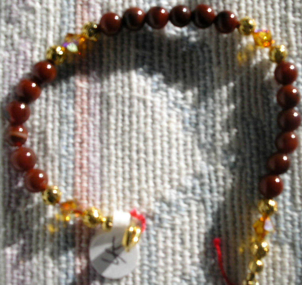 Kabbalah Bracelet made with beautiful color ruby 6mm Carnelian. and beautiful Gold Beads & Swarovski crystal accents. Traditional scarlet thread is threaded thru the beads. The thread was wounded around Rachels tomb 7 times to protect from the influences of the evil eye as chronicled by Kabbalah ancient sages. Size 6.5-9.0 State size when ordering. Over 8.5 add $5.00 per half size. 14Kt plated clasp and beads & Swarovski accents. |