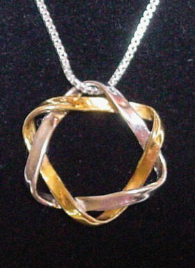 Unique design of a mobius-- looser fluid triangle It's one-sided surface flows from inner to outer and back again expressing rthe continuous journey along the pathway of Life. A Double Mobius Pendant Mobius-Double Double Mobius pendant Sterling silver and 14 karat gold plated with Silver Chain. Available in all Silver/14 KT Gold Overlay in 5/8" or 7/8" (comes with Silver Chain) or 14 Kt solid Gold in 5/8 or 7/8" with 14 Kt Gold Chain