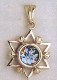 3/4-inch diameter Star of David Israeli Artisan Roman Glass Pendant or Charm in Sterling Silver or 14Kt GoldPendant with Chain Stunning Roman Glass double star Wonderful Magen David pendant featuring a inner star representing the double committment. Sterling silver $65.00 or 14Kt Gold $132.00 Hand made from Israel, takes from 3-6 weeks for delivery.