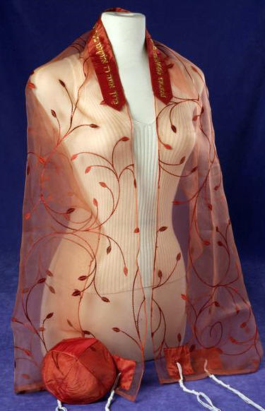 red/peach chiffon tallit. Bag & Kippah included in Set. Size 22" X 72". |