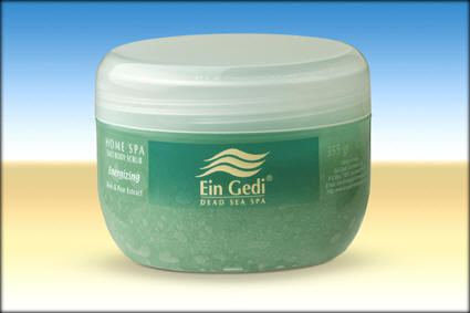 Catalog #4251956 Body Scrub 355gr. A clean and fresh Body Scrub, that is non-oily and easy to use. This unique Dead Sea Mineral Salt Scrub has been enriched with Vitamin E as well the healing benefits of Pure Essential Oils. This Body Scrub will peel away and remove dead skin cells and leave your skin radiant, smooth, healthy and younger looking. The beneficial combination of Dead Sea Mineral Salts and Essential Oils improves skin cell circulation while nourishing and moisturizing. Direction: Shower or bath with Ein Gedi's Home Spa Shower Gel. Take generous amount of the Salt Scrub and massage gently over your body. Using a gentle circular motion will exfoliate rough dead skin cells. Leave Salt Scrub on for a minute, then wash off with water. Refreshing: With bergamot, lime & spearmint. Energizing: With kiwi & pear.