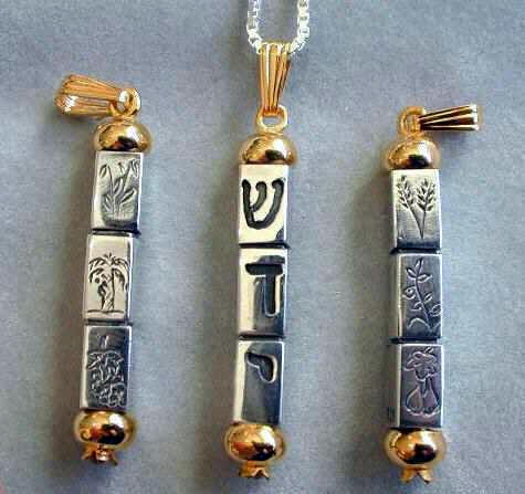 Made of a Solid shaft with 3 rotating cubes, depicting the Mezuzah's "Shadai" , engraved are the six fruits of creation: Wheat, Oats, Olive, Date, Grape, Fig. the Pomegranate locking at the bottom.